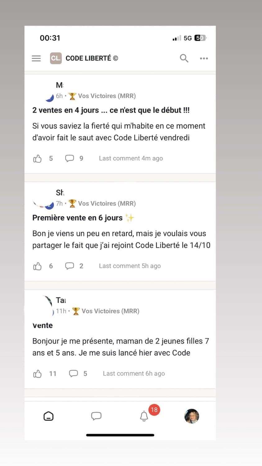 Tu reçois la formation Code Liberté et aussi l'accès à une communauté gratuite d'entrepreneurs du monde entier, tout niveaux d'expérience confondu, prêts à se connecter avec toi et te soutenir !